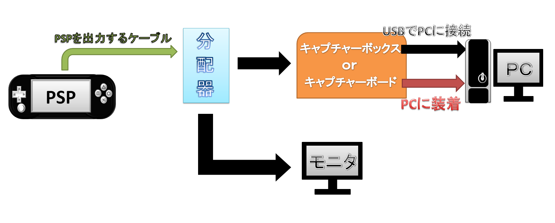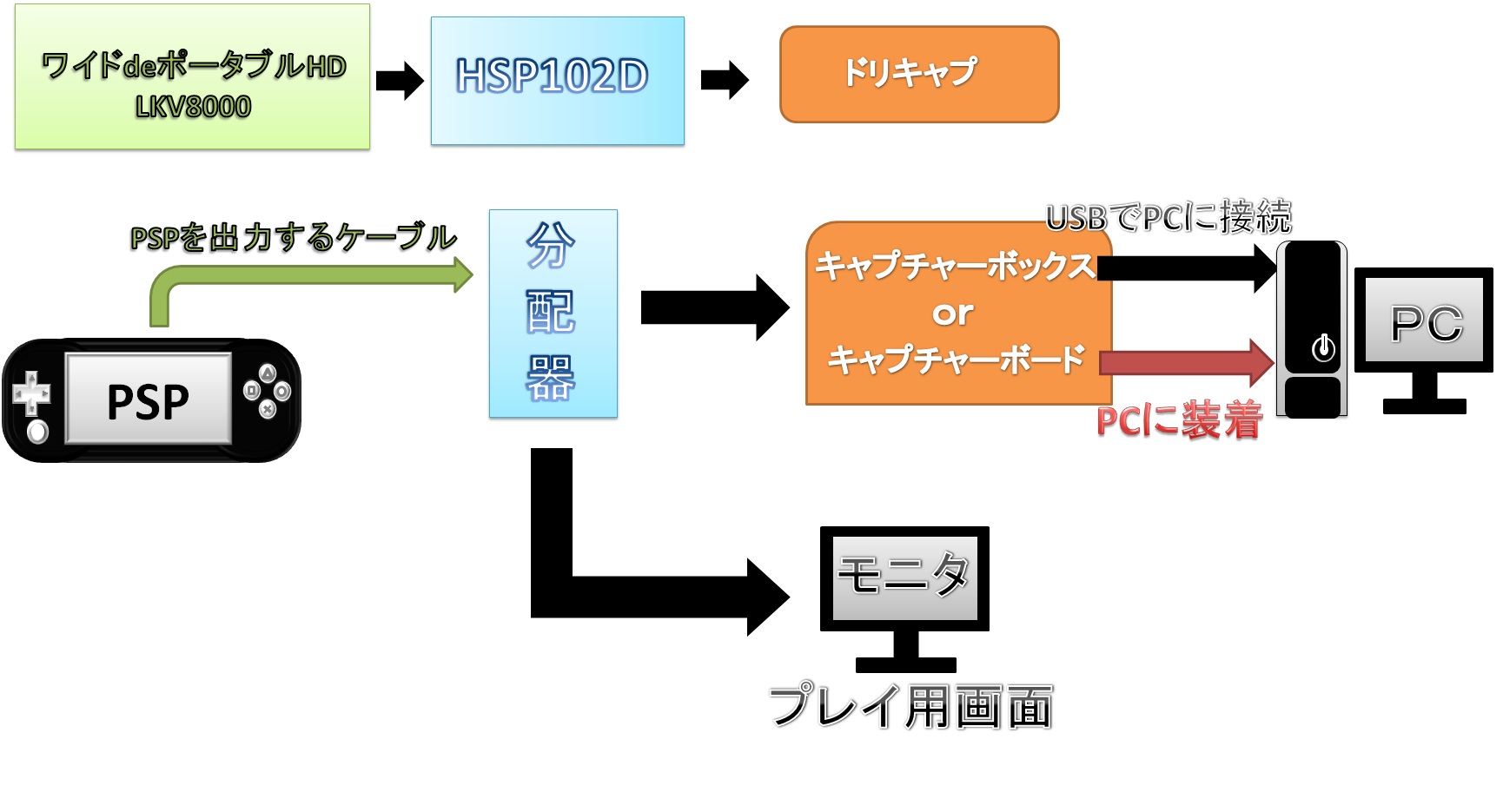 このように、接続順はPSP→ケーブル→分配器→キャプチャーボードorボックス→PCになります。